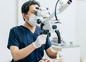 当院では、マイクロスコープ(歯科用実体顕微鏡)を採用しています。これにより、肉眼の最大約30倍まで拡大した視野で手術を行うことができ、より精度の高い治療が可能です。適応となるのはインプラント治療の外科手術、サイナスリフト(骨造成)、補綴製作、メインテナンなどです。細部まで確認できるため、患者様の負担を最小限に抑えて施術できます。